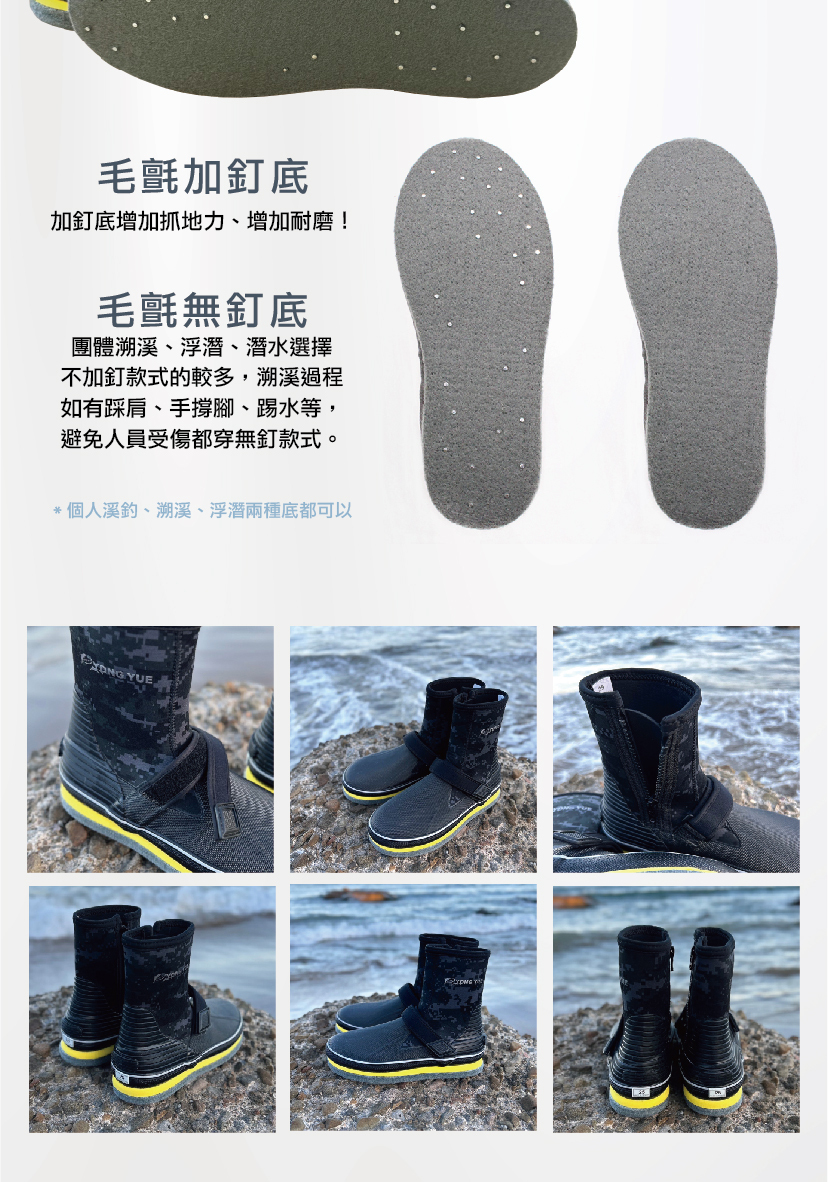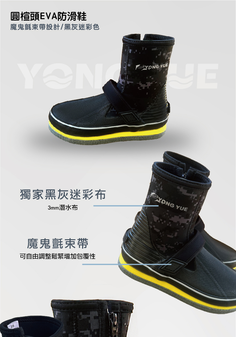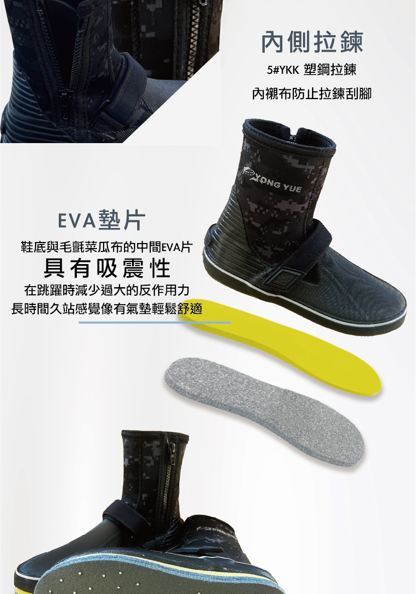 鞋身-3mm迷彩潛水布、5# YKK塑鋼拉鍊、腳裸魔鬼氈設計、SBR單面盲逢、內層上膠加強貼合