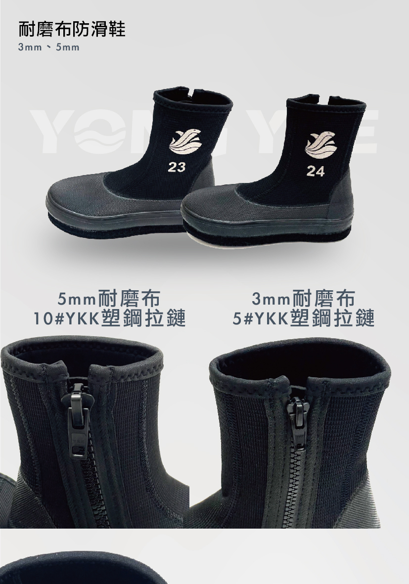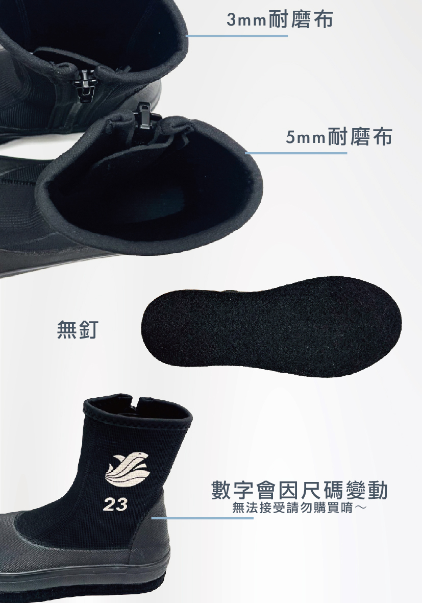 鞋身-3mm耐磨潛水布+ YKK 5# 塑鋼拉鍊、5mm耐磨潛水布+ YKK 10# 塑鋼拉鍊