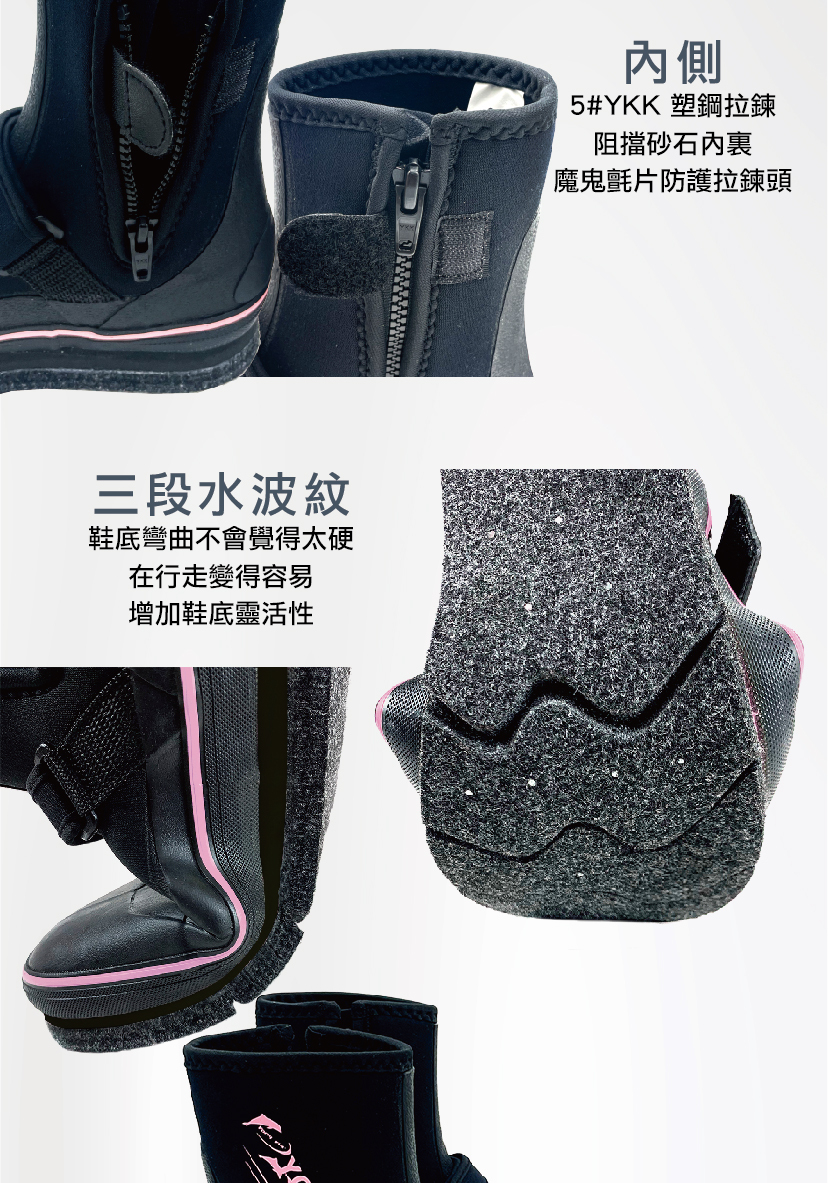 ■ 材質:鞋身-5mm潛水布、5#YKK 塑鋼拉鍊、SBR單面盲逢、內層上膠加強貼合