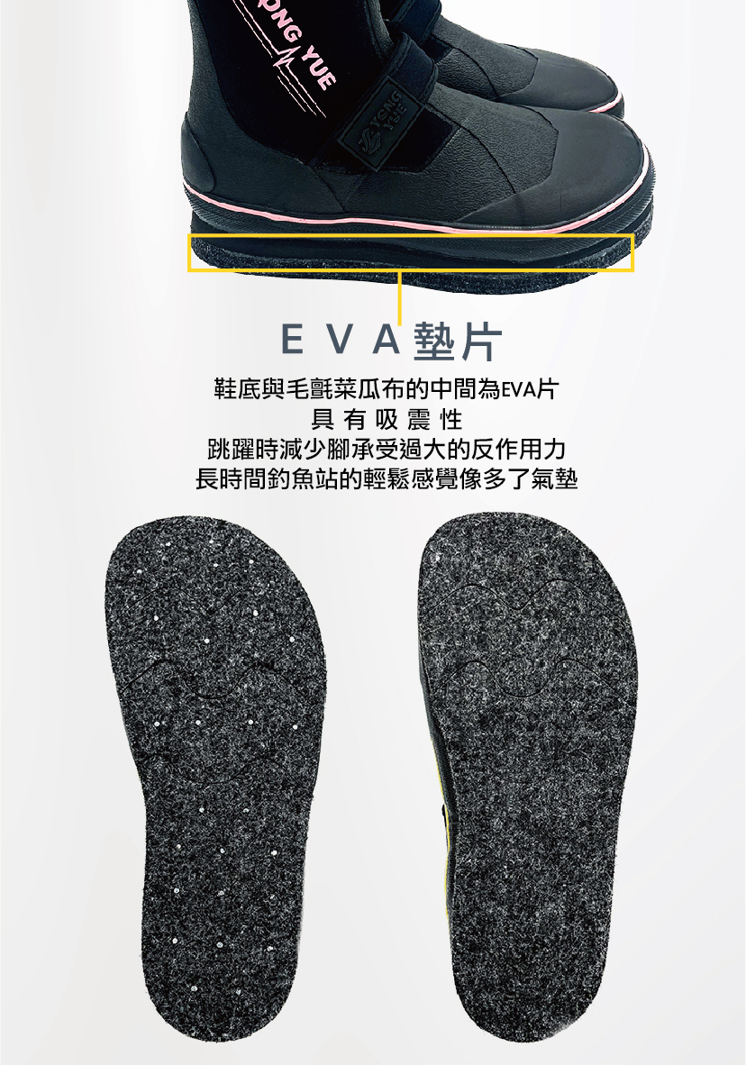 鞋底-日本S牌同等級灰色12mm高密度毛氈菜瓜布底、三段水波紋中割毛氈、56支加強熱處理鎳合釘、全片式EVA墊片耐久性貼合(保護腳掌吸震作用)