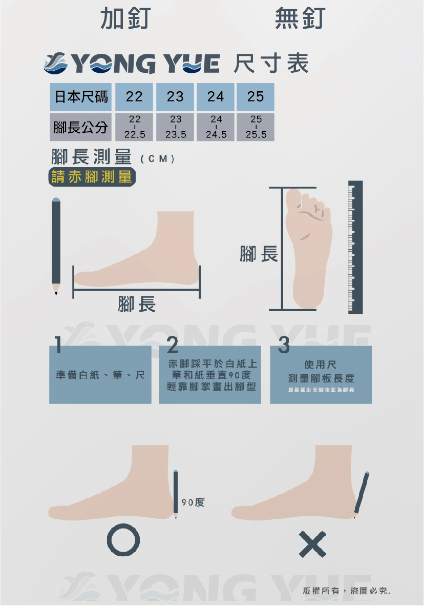 特殊腳型者例如:寬腳板、腳裸肉多、腳板肉多、大小腳等,請自行斟酌加大尺寸