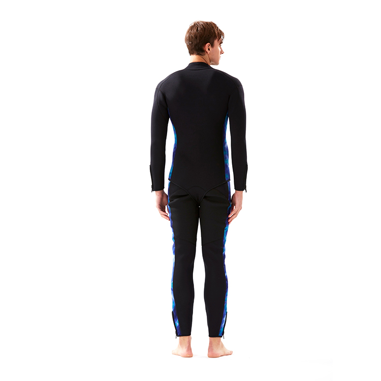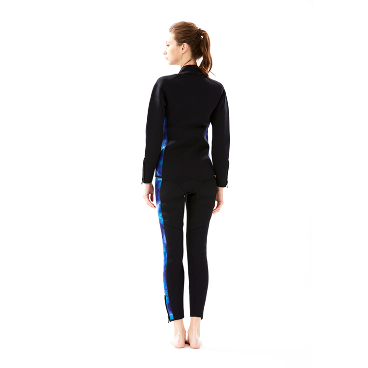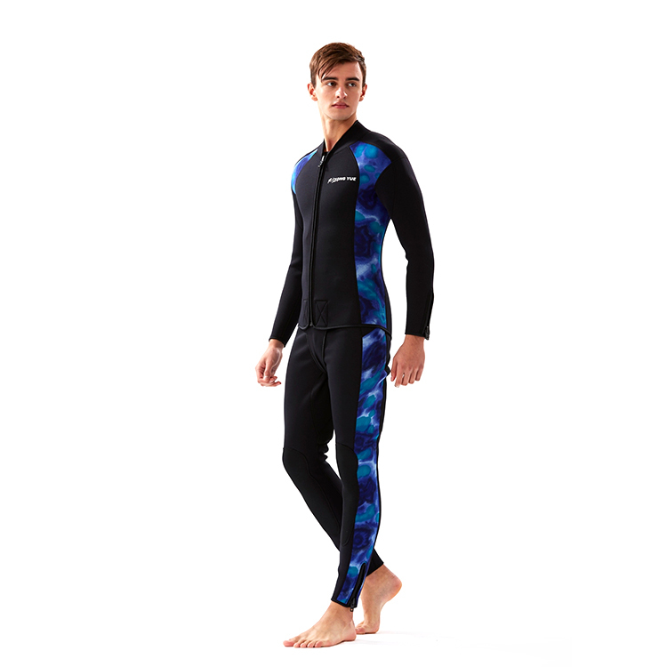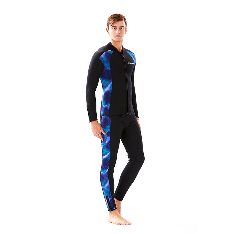 長褲-3.0mm藍迷彩/黑潛水布 、褲前5#塑鋼拉鍊頭、腰際車鬆緊帶可調整鬆緊、褲口10#塑鋼大拉鍊頭、臀部及護膝車縫黑色耐磨布,加強耐磨