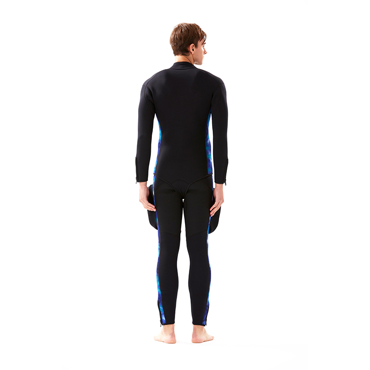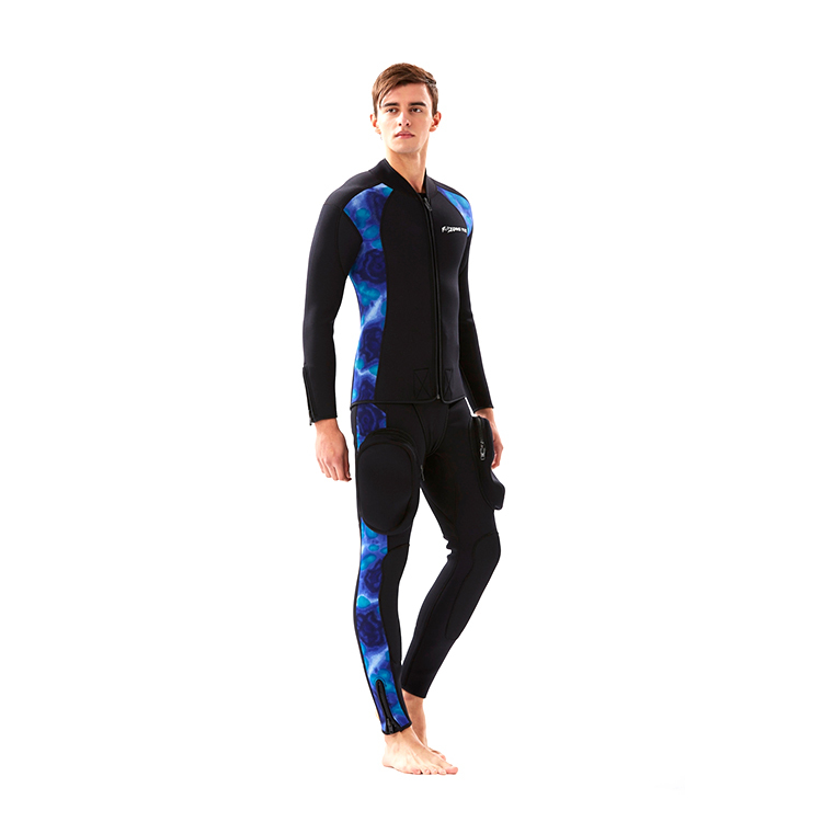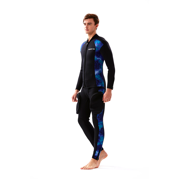 長褲-3.0mm藍迷彩/黑潛水布 、褲前5#塑鋼拉鍊頭、腰際車鬆緊帶可調整鬆緊、褲口10#塑鋼大拉鍊頭、臀部及護膝車縫黑色耐磨布,加強耐磨